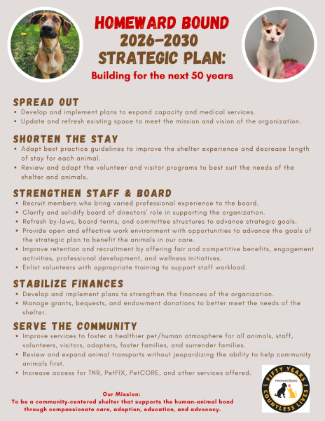 In 2023 we launched a Strategic Plan that will lead us through 2025. In 2025, we will celebrate 50-years of serving animals in Addison County!