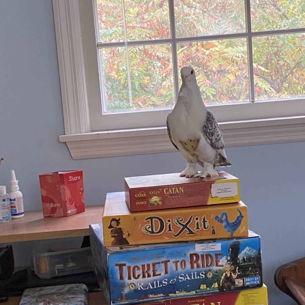 Widget has a sweet, calm, and curious personality. He doesn’t talk like a parrot but coos to “chat.” When he’s energetic, he’ll show off a little pigeon dance. He’s smart, responds to training, and is closest to the family’s teenager, whose room he usually stays in.